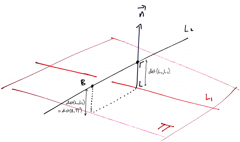 - Then $\dist(L_1,L_2)=\dist(B,\Pi) = \frac{|\vec{AB}\cdot \nn|}{\|\nn\|}$
