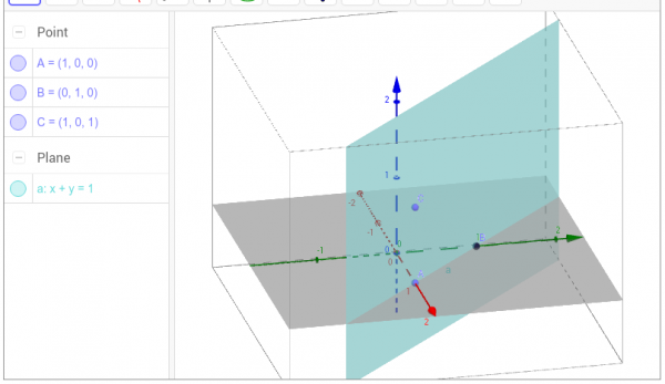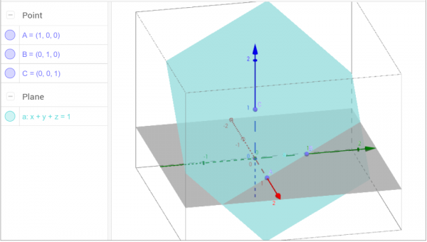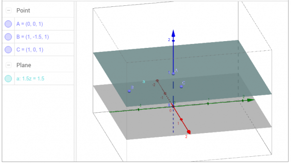 - $z=1$, viewed as the equation $0x+0y+z=1$